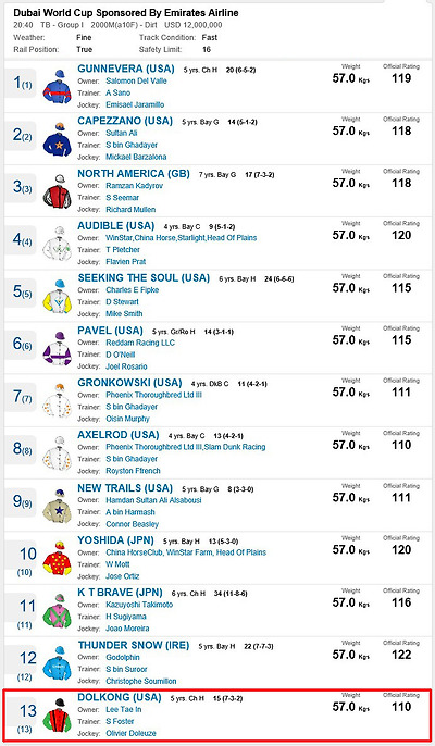 총 13마리가 출전하는 두바이월드컵 메인경주는 총상금
