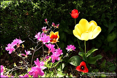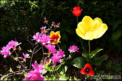 영산홍, 빨강 색이섞인 튤립과..골든 이벨톤 노랑 튤립,서로 어울어져 소통하는 모습으로 상상해 보시면서..