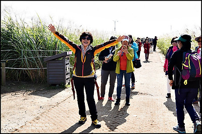 서울억새축제장 입구에서 손을 들어 환호하고 있는 총무님!.