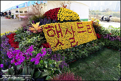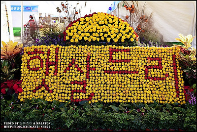 축제 현장 정문에 설치된 가을의 상징 국화로 장식된 햇살드리..축제 화단..↓