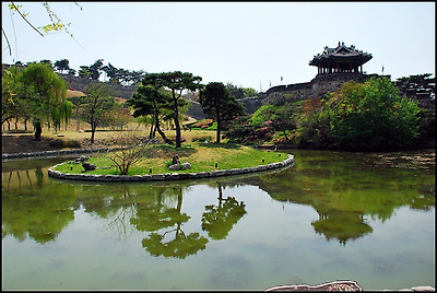 경기도 수원화성 성곽 중 방화수류정,용연(龍淵)과 어우러진 아름다운 경관을 연출하고 있다..