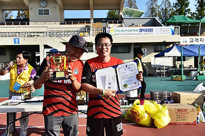 서둔교회 족구 우승팀 트로피와 상장 상금을 들고 기뻐하는 황홍연 선은규 안집님!~