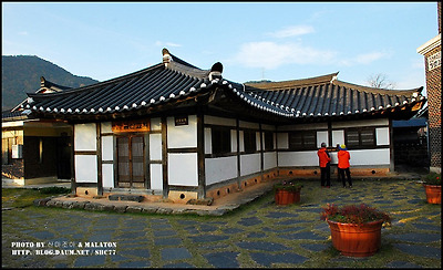 흰색 수성페인트로 마감하고 있다. 지붕은 시멘트기와를 얹은 우진각 지붕입니다.