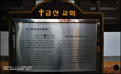 이곳을 바라 보건데... 한국의 전통양식과 서양식 금산교회의 특징을 조화시킨 이 교회는 전통한옥 기억자(ㄱ)형태로