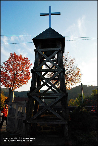 전북 김제시 무악산 기슭에서 자란 고목으로 세운 금산교회 종 탑 전경입니다.