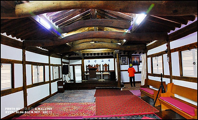 금산교회 내부도 들려 봅니다.바닥은 장마루를 깔았고 내부 벽체 및 천장부에는 목부재를 제외하고
