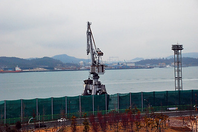 삼학산 중턱에서 바라본 대형 크래인도 보이고 우측으로 김대중 노벨평화상 기념관도 조망됩니다.