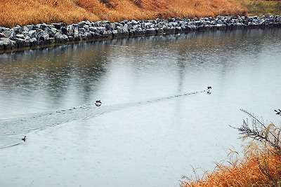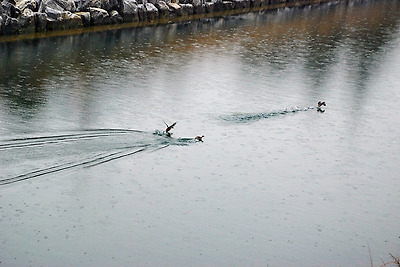 삼학도 강변길 따라 오르는 삼학산 주변 강가에는 비내리는 광경속에 물닭들의 사랑나누기로