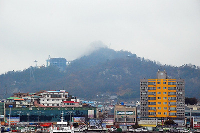 비내리며 안개낀 유달산이 보이는데, 저 아름다운 산맥 위로 해상 케이블카가 오르내리는 모습도 땡겨봅니다.
