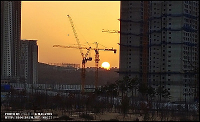 크레인 사이로 빵긋 떠오르는 아름다운 일출 광경을 바라보며 새해 설날 아침 금년 한 해 사랑하는 가족의 건강과