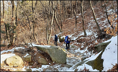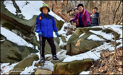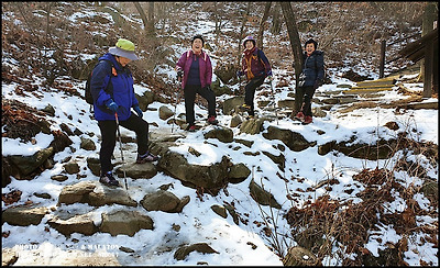 칠보산 등산여행?을 마치고 하산 준비로 눈이쌓인 바위 사이로 하산을 서두르는 회원님들..