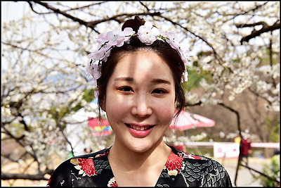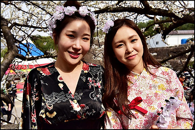 아름답고 예쁜 화관과 꽃핀을 판매하고 있는 예쁘고 귀여운 매화축제 현장 도우미 학생들..