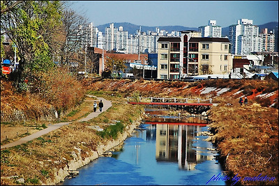 시냇가 옆 산책로에서 여유롭게 산책을 즐기고 있다.