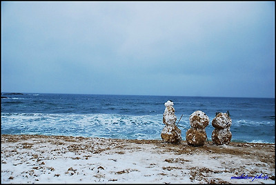 경포해수욕장 세찬파도와 함께 정신도 가다듬고..모래 눈사람 눈고양이?↑