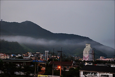 운무에 감싸인 고요한 새벽 영덕읍 전경과 고불봉