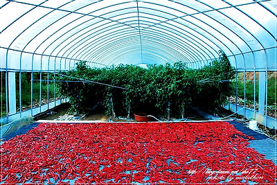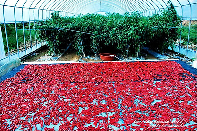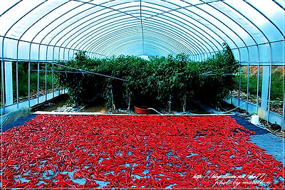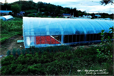비닐하우스에 도둑맞고 남은고추를 수확하여 건조 하고 있는 광경