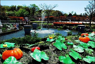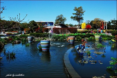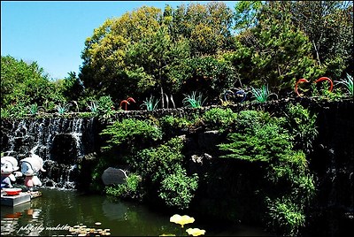 유리꽃과 유리인형으로 조성된 작은 연못의폭포..