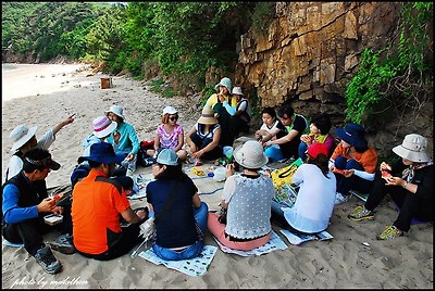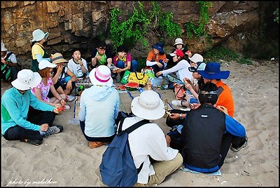 입파도 해변가에 둘러 앉아 간식을 먹으면서..담소하고 있는 수료생들..