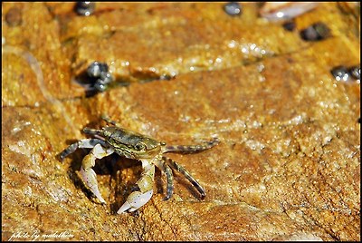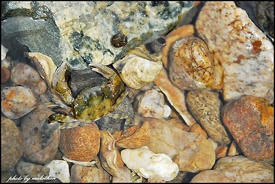조개껍질속에서 휴식을 취하고 있는 작은 방게..