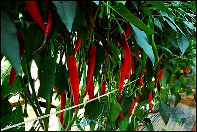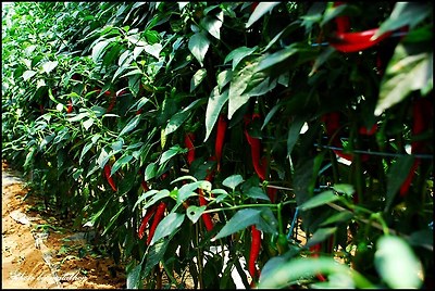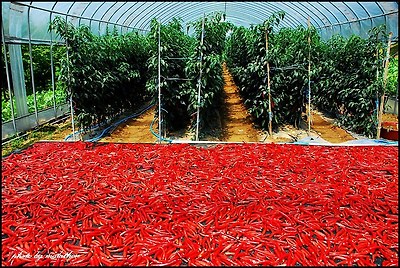 있습니다.지난주 부터 첫 수확을 한 후 비닐하우스 고추밭 입구에 널린 탐스런 고추가 태양빛에 뽀송 건조 되고 있지요.