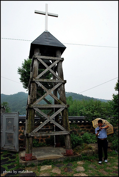 고목으로 세운 금산교회 종 탑 전경입니다.