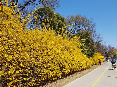 *대구 신천둔치에 봄의화신 황금물결이 장관을 이루는 개나리꽃이 만발하여 산책하는 시민들의 시선을 끌고 있습니다.