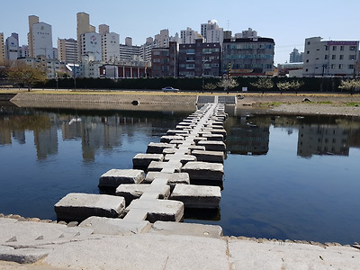 건너편 신천동로에는 공간이 없어서 이 징검가리를 건너와서 동구시민도 같이 활용하고 있어요.
