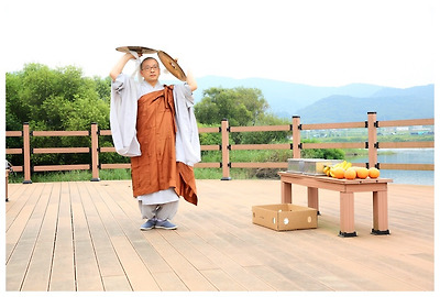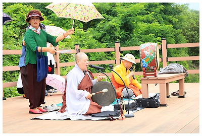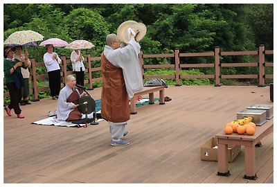 데크위에서는 제물이 차려저 있고 방생법회가 진행되고 있다.