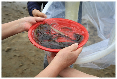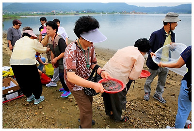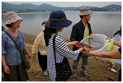 아마도 시장에서 추어탕집으로 팔려가려는 미꾸라지를 구해와서 방생하는것으로 보인다.