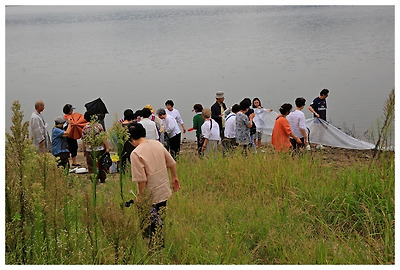 데크 아래의 호수에서는 가져온 미꾸라지를 신자들이 한창 호수로 흘려 보내고 있다.