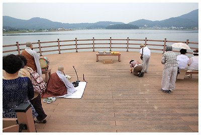 스님의 독경소리가 아침 호수의 적막을 깨고 멀리 퍼져 간다.