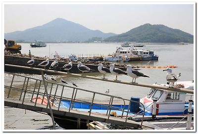새우깡 얻어먹을려는 갈매기들이 무리지어 배를 따라 다녔는데