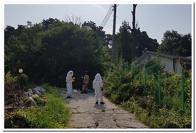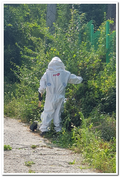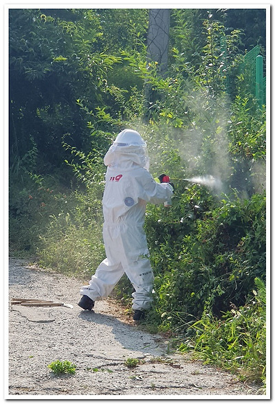 벌집 제거 후에 남아있던 벌들을 약품을 분사해서 쫓아버린다.