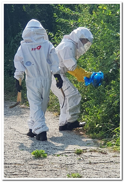 방제복을 갈아 입은 소방관들이 낫으로 풀숲을 해치면서 벌집에 다가간다.
