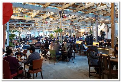 방직기계들은 사라젔고 넓은 공간에 차를 마시는 탁자들이 놓여있다.