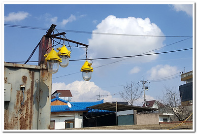 지붕에 삼각형의 환기통과 채광시설이 보인다.