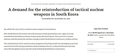 2017년 10월 20일 자유한국당(대표 홍준표)과 전술핵재배치미주위원회가 ‘전술핵 남한 재배치’를 바랐으나 뜻을 이루지 못했다. 11월 19일까지 30일 동안 청원 운동을 벌였지만 서명이 635건에 그쳐 백악관 쪽 답변 없이 페이지가 닫혔다(closed).