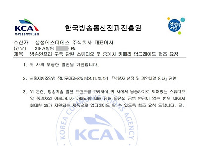 ▴KCA가 카메라를 ‘HDX-970AP’와 ‘97AP’로 바꿔 줄 것을 요청하며 삼성SDS에 보낸 2012년 7월 26일 자 공문.