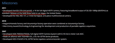 ▴이케가미 홈페이지에 소개된 ‘HDK-97A’와 ‘790EXiii’ 개발 연도. ‘HDK-97A’가 2011년 4월 미국 라스베이거스 방송장비전(NAB)에서 처음 공개됐음을 알 수 있다. 2007년에 개발돼 2008년부터 판매된 ‘790EXiii’와 ‘79EXiii’는 2012년부터 판매를 멈춘 것으로 알려졌다. 이런 흐름 때문에 2011년 빛마루 입찰에선 “곧 판매를 멈출 카메라를 비싸게 팔려 한다"는 지적이 일기도 했다.