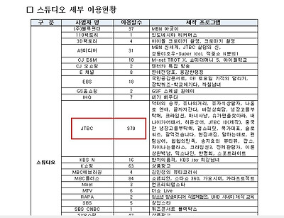 특히 JTBC가 같은 기간 동안 500평짜리 대형 스튜디오를 쓴 비율은 86.8%에 이르렀다. 대형 스튜디오 전체 대여 일수 767회 가운데 666일이 JTBC 예능 프로그램에 쓰인 것. 간판 예능 프로그램 전용 스튜디오 구실을 한 셈이다.