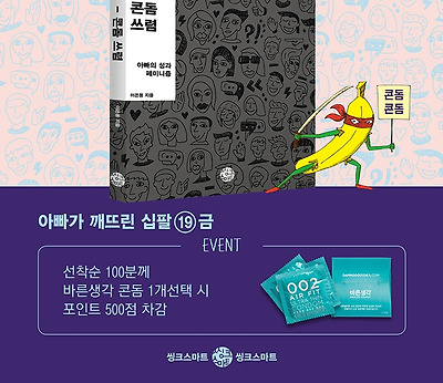 알림 하나. 도서출판 씽크스마트가 <아들아 콘돔 쓰렴 ㅡ 아빠의 성과 페미니즘> 독자께 콘돔을 드리기로 했답니다. 인터넷 서점 알라딘과 예스24, 인터넷 교보문고에서 책을 사는 분께 ‘바른생각’이 만든 콘돔을 곁들여 드린다고 하네요.