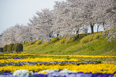 색색의 펜지꽃과 어우러진 벚꽃을 담아 봅니다.