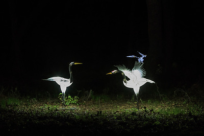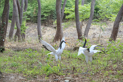 한 쌍의 학이 날갯짓을 하며 춤을 추고 있는 듯합니다.