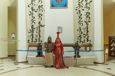 군인들의 옷과 몽골 전통 복장을 입고 추억의 사진을 담고 있는 몽골인