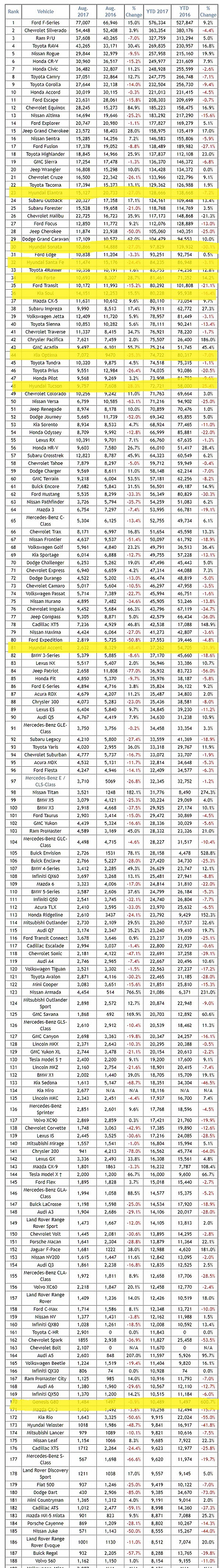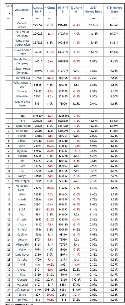 미국전체시장은 작년대비 8월 -2.3%으로 후퇴했습니다. 현기차는 닛산과 함께 심각한 8월을 보낸 브랜드입니다. 현기차는 무려 -28%의 붕괴수준입니다. 현기로 한 몸에 묶으니 기아차가 억울하다고 변명하겠지만 각 모델을 살펴보면 현대차에게 핑계를 돌릴 수 없는 참담한 숫자입니다.