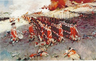 그림 설명: 1775년 벙커힐 전투 모습입니다. 밀집대형으로 전진하는 모습을 비웃는 전사 초보자들이 많은데, 밀집대형은 고대 로마와 그리스 팔랑스부터 이어져온 기본적인 보병대형입니다. 창과 방패를 들고 화살을 맞아가며 적에게 다가가 방패로 밀어대던 전형적인 백병전 전술입니다. 전장식 소총 시대에는 속사가 불가능했고 일제사격 후에는 엄청난 탄연(화약연기)으로 연사가 불가능했기 때문에 근거리까지 서로 접근해서 한 두 번의 일제사격만 했습니다. 밀집대형에는 고참병을 뒷열에 배치해서 일제사격 후에 대열을 무너뜨리고 도망치는 것을 막았습니다.