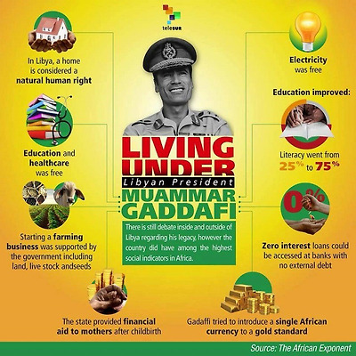 카다피 시절 리비아는 석유 팔은 돈이 국민들의 통장에 자동 입금되고, 무상주택 무상교육 무상의료 등으로 아프리카에서 가장 잘 살던 나라였습니다.