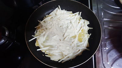 밀가루와 부침가루를 1 ; 1 비율로 섞은 다움 프라이팬에 식용유나 오리브유 또는 해바라기씨유와 까놀라유를 두른후 감자전을 붙이면 끝이죠....! !