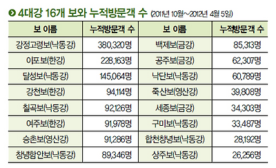 4대강살리기추진본부 하천이용팀 홍남식 사무관은 “낙동강은 4개 강 중 가장 많은 8개 보가 있는 데다 수계가 길어 방문객이 가장 많다”며 “올해 들어 자전거도로 등과 각종 체육시설을 속속 개방해 방문객들이 급격히 늘고 있다”고 전했다.