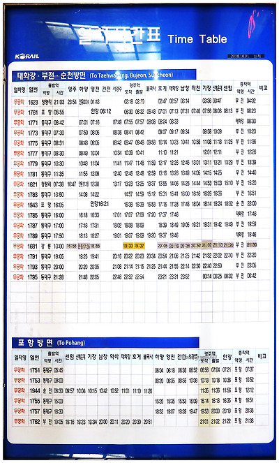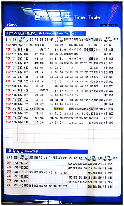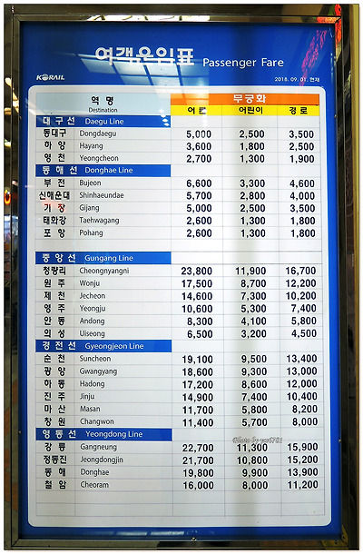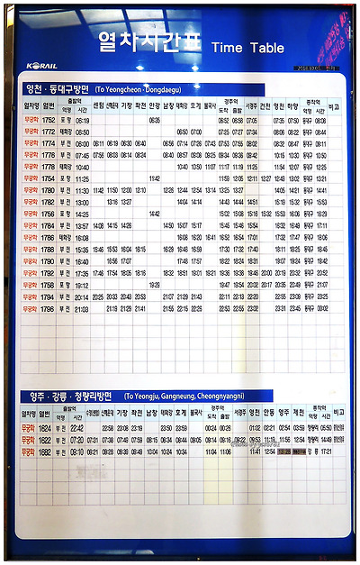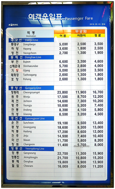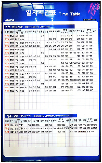 경주역 열차(기차)시간표, 여객운임표(무궁화)